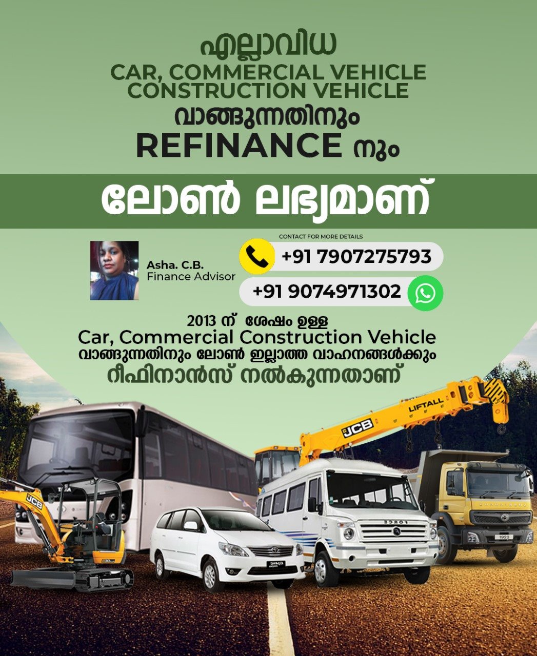 ChatGPT said: Easy Loans for All Types of Vehicles – Hassle-Free & Fast! 🚗🚛🏗️ Asha C.B. – Finance Advisor ✅ Loans Available For: Cars Commercial Vehicles Construction Vehicles (JCB, Liftall, etc.) Refinance for vehicles without existing loans 🎯 Vehicles from 2013 onwards are eligible! 💰 Buy or refinance with ease – tailored solutions to suit your needs. 📞 Contact for More Details: +91 79072 75793 +91 90749 71302 Drive, Build, and Grow – We Finance Your Next Move!