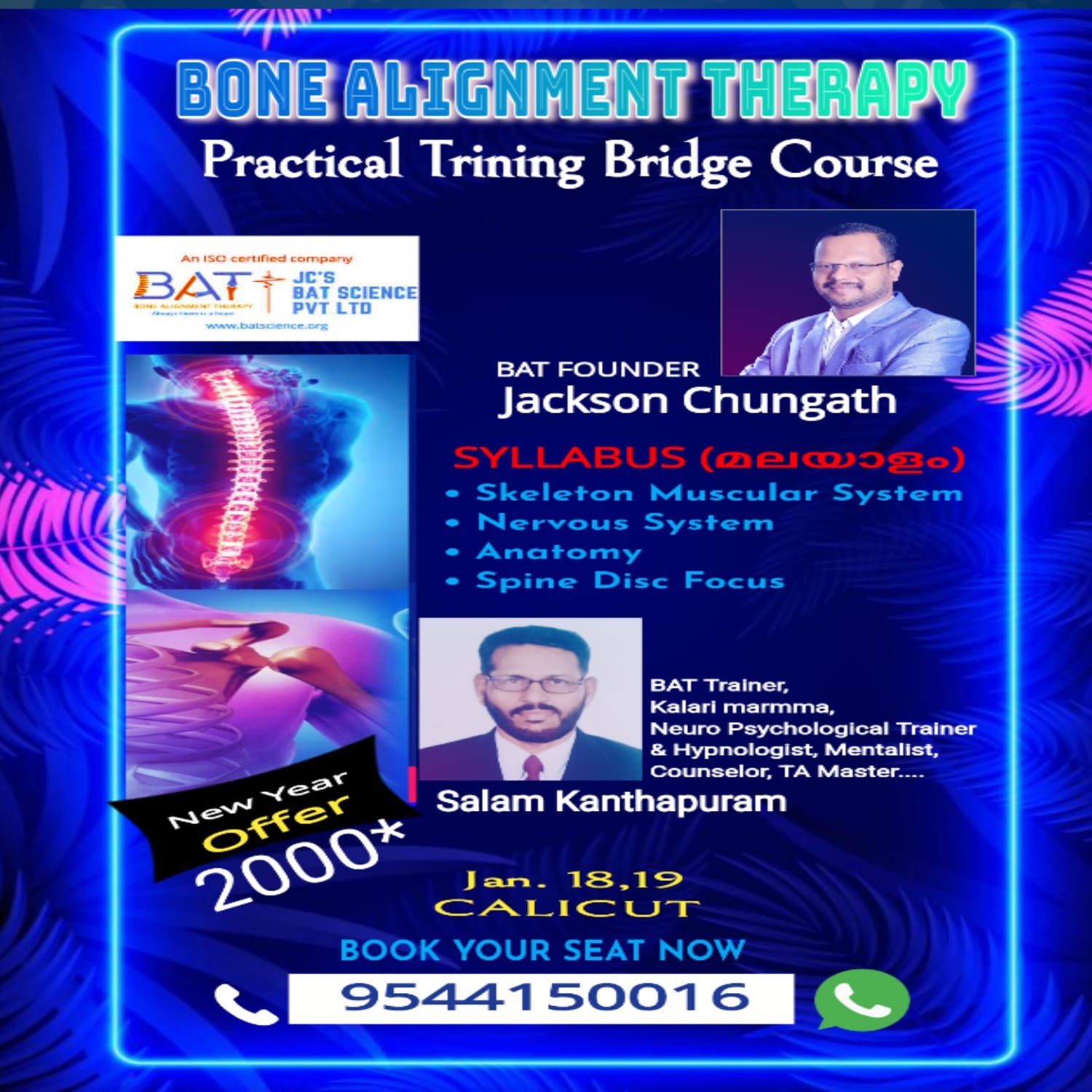 π΅ Bone Alignment Therapy β Bridge Course Transform Lives. Heal Naturally. Empower Yourself. π Location: Kozhikode π Dates: January 18 & 19 π₯ New Year Offer: Only βΉ2000/- Also available in all districts across Kerala! β Why Join This Course? πΉ Develop New Skills β Unlock your healing potential and transform lives, starting with your own. πΉ Enhance Your Practice β Take your healing or wellness profession to the next level with Bone Alignment Therapy. πΉ High-Demand Skillset β Master advanced techniques and offer more value to your clients. πΉ Hands-on Case Studies β Learn practical methods through real-life healing examples. πΉ Path to Becoming a Healing Master β Begin your journey toward becoming a certified Bone Alignment Therapist. πΉ Become a Change-Maker β Empower yourself to relieve pain and restore well-being in others. π Limited Seats Available β Register Now! π² WhatsApp or Call: 95441 50016 Donβt miss this opportunity to step into a future filled with healing, purpose, and prosperity. πΏ