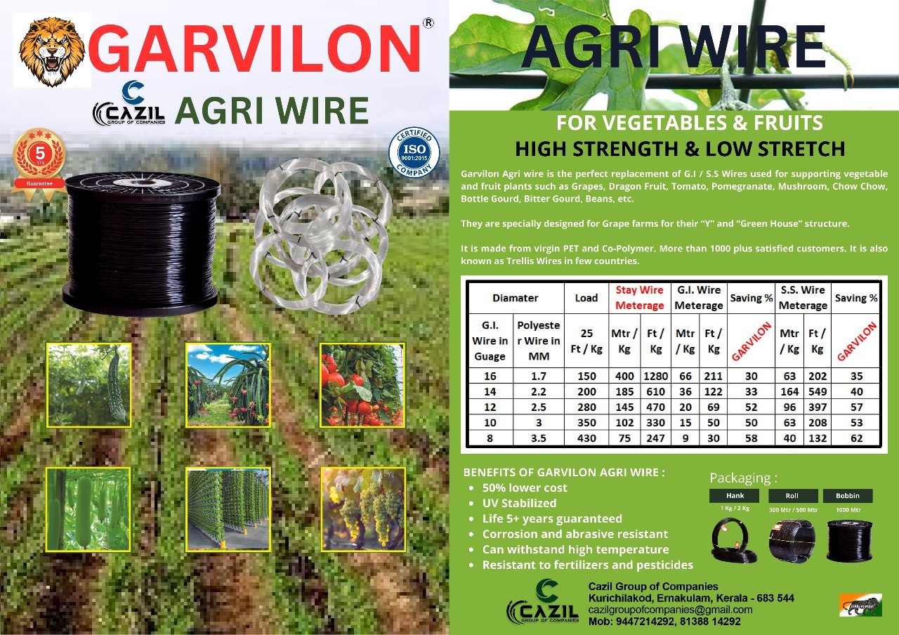 GARVILON AGRI WIRE Strong. Durable. Cost-Effective. Perfect Support for Vegetables & Fruits Looking for the ideal solution to support your crops? 🔰 Garvilon Agri Wire is the ultimate replacement for traditional G.I. / 5.5 wires — engineered specifically for vegetable and fruit cultivation like Grapes, Dragon Fruit, Tomato, Pomegranate, Mushroom, Chow Chow, Bottle Gourd, Bitter Gourd, Beans, and more! 🔰 Specially designed for Grape Farms, including "Y" trellis and Greenhouse Structures. ✔️ Made from Virgin PET and Co-Polymer ✔️ Used by 1000+ satisfied farmers ✔️ Known internationally as Trellis Wire ✅ Why Choose Garvilon Agri Wire? 50% Lower Cost than traditional wires UV Stabilized for longer life 5+ Years Life Guaranteed Corrosion & Abrasion Resistant Withstands High Temperatures Resistant to Fertilizers & Pesticides 📍 Cazil Group of Companies Kurichilakod, Ernakulam, Kerala – 683 544 📧 Email: cazilgroupofcompanies@gmail.com 📞 Call Us: 94472 14292 | 81388 14292