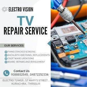 πΊ ELECTRO VISION β Expert TV Repair Services in Thrissur Reliable. Fast. Affordable. Got a faulty TV? Donβt worry β Electro Vision is here to bring your screen back to life! We specialize in repairing all types of LED, LCD, and Smart TVs β offering quick and professional service for all major brands. π§ Our Services Include: β LED TV Repair β LCD TV Repair β Smart TV Troubleshooting β Screen, Sound & Power Issues Fixed β Genuine Parts & Quality Workmanship π Visit Us At: Electro Tower, St. Maryβs Street, Kuriachira, Thrissur, Kerala π Contact Us: π± 0487 225 2336 | 93888 52545 π‘ ELECTRO VISION β We Fix, You Watch! Trusted by customers across Thrissur for fast and affordable TV service.