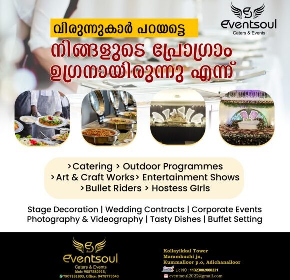 🎉 Let Your Guests Say... “Your Event Was Absolutely Incredible!” From elegant weddings to lively birthday bashes – Eventsoul Caters & Events brings your dream celebration to life! 🎊 We Specialize In: ✅ Weddings & Receptions ✅ Inaugurations & Birthday Parties ✅ Corporate Events & Outdoor Functions ✅ Stage Arrangements, Decor & Catering ✅ Light & Sound, DJ Programs & Live Music ✅ Veg & Non-Veg Sadhya | Tasty Dishes ✅ Photography, Videography & Wedding Cards ✅ Professional Beauticians & Hostess Services ✅ Church, Temple & Home Functions ✅ Bullet Riders, Art & Craft Activities ✅ Complete Wedding Contracts & Entertainment Shows 📍 Office Address: Kollayikkal Tower, Maramkuzhi Jn, Kummalloor P.O, Adichanalloor 📞 Contact Us: 90875 82915 | 79071 81803 | Office: 94787 73543 📧 Email: eventsoul2022@gmail.com 🆔 License No: 11323002000221 ✨ Eventsoul Caters & Events – Where Every Event Becomes a Celebration!