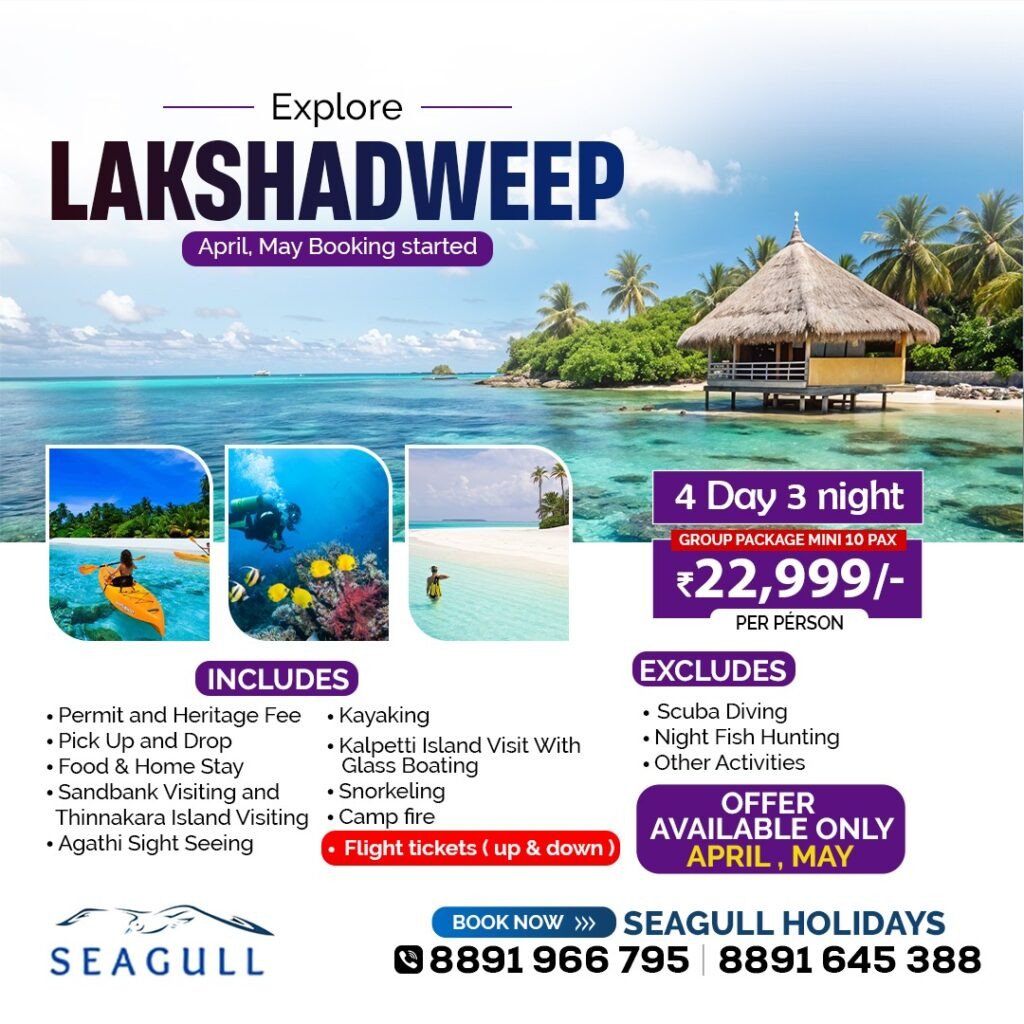 🌊 Explore LAKSHADWEEP Like Never Before! 🏝️ 4 Days | 3 Nights – Group Package 🎉 Just ₹9,999/- Per Person (Min. 10 Pax Required) 🌟 PACKAGE INCLUSIONS: ✔ Permit & Heritage Fee ✔ Pickup & Drop ✔ All Meals & Comfortable Homestay ✔ Sandbank Visit ✔ Thinnakara Island Excursion ✔ Agatti Sightseeing & Kayaking ✔ Kalpetti Island Tour + Glass Bottom Boating ✔ Snorkeling Adventure ✔ Cozy Campfire Nights ❌ Exclusions: ✖ Flight Tickets ✖ Scuba Diving ✖ Night Fish Hunting ✖ Optional Activities 📍 Organized by: SEAGULL HOLIDAYS 📞 Call Now to Book: +91 88919 66795 | +91 88916 45388 🚤 Limited Spots. Unlimited Memories. 💼 Book your escape to paradise today with SEAGULL – Your Gateway to Lakshadweep!
